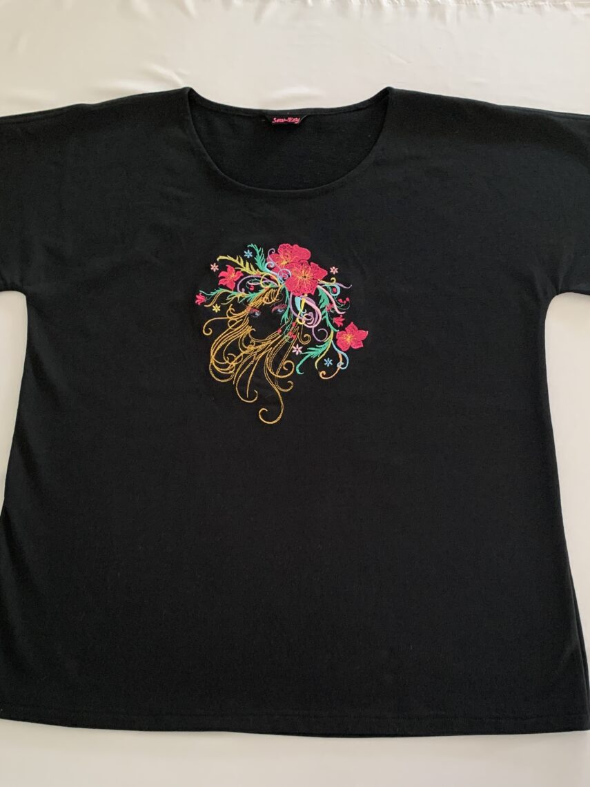Ladies semi fitted T-shirt has short dolman cuffed sleeves, and a round neckline.